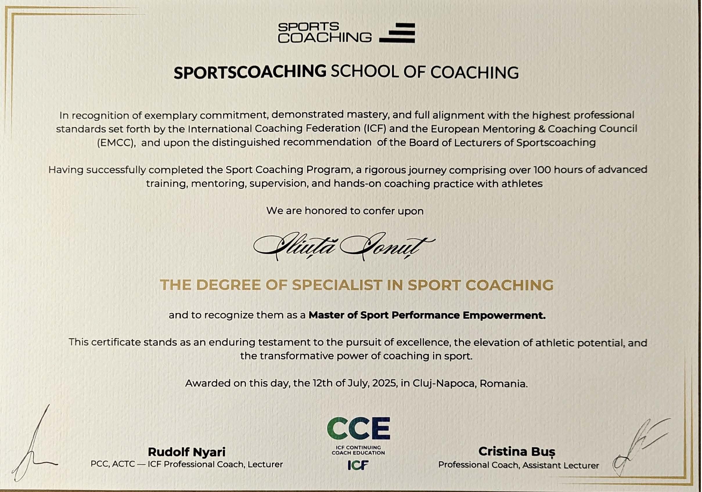 Sunt Specialist în Coaching, acreditat la nivel național și internațional, dedicat să ajut oamenii să își atingă potențialul maxim. Cu certificări de la Ministerul Educației Naționale și Ministerul Muncii, precum și o acreditare de la EMCC Global, ofer suport de calitate în dezvoltarea personală și profesională. Am o viziune clară asupra potențialului uman și cred cu tărie că, prin sprijinul potrivit, fiecare dintre noi poate atinge excelența.